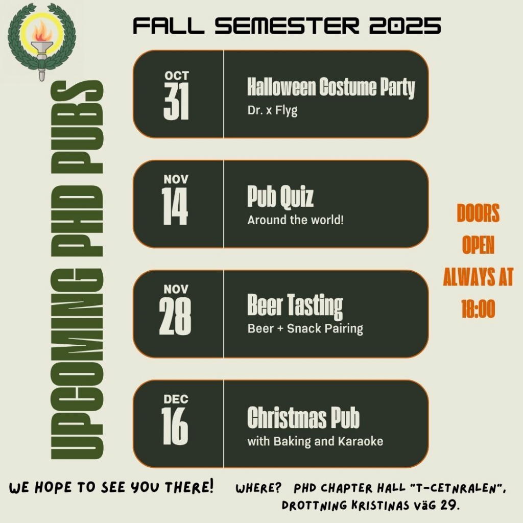 The PhD chapter is proud to present the upcoming events for the year 2025-2026! It’s going to be an awesome year of festivities, events, and mingling with other PhD students! It’s not so scary to meet other researchers passionately pushing knowledge forward.